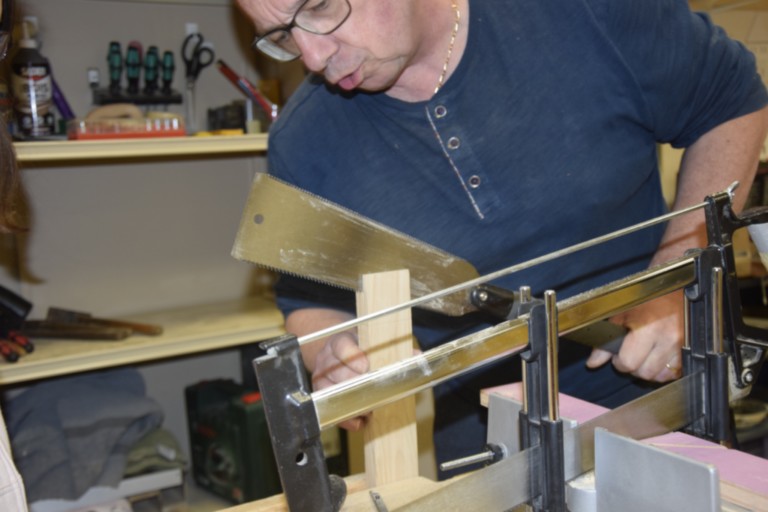 Outils utilisés : Tous les outils d’un menuisier : Equerre, Réglet, Crayon, Scie égoïne, Scie à chantourner, Scie à onglet, Ciseau à bois, Râpes et limes, papier de verre, …