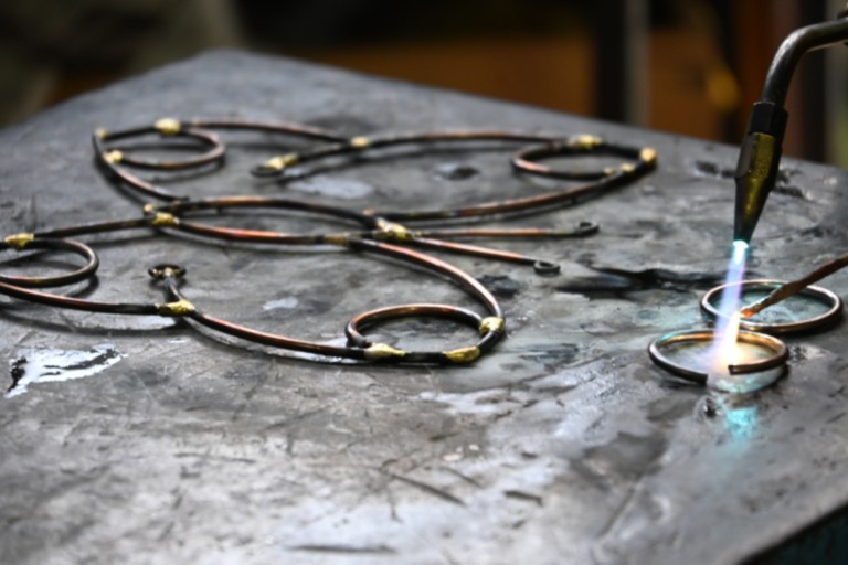 Outils utilisés : Crayon, pointe sèche de traçage, mètre, réglet, compas, équerre, scie à métaux, lime, pince, marteau, étau, chalumeau...