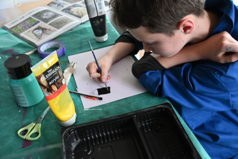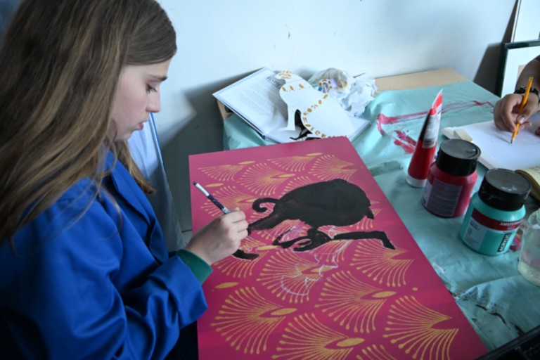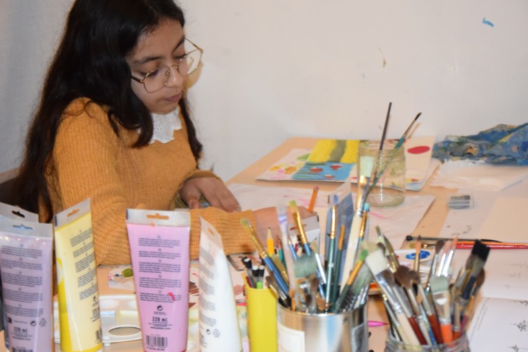 Matériaux utilisés : peintures acryliques, encres, crayons et feutres, papier aquarelle